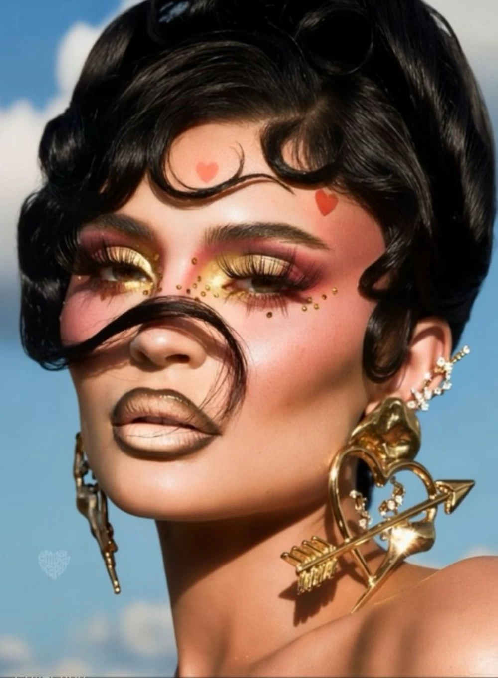 For a special Valentine’s Day photoshoot, Kylie Jenner chose to present a different visual concept, drawing inspiration from the doll’s features but with a striking modern spirit, blending boldness and innocence at the same time. The look relies on sharp and detailed make-up, the eyes stand out with a wide and precisely defined style, giving her a seductive glassy gaze, and the eyelashes are thick and exaggerated, emphasizing the dramatic character that is the basis of the whole idea.